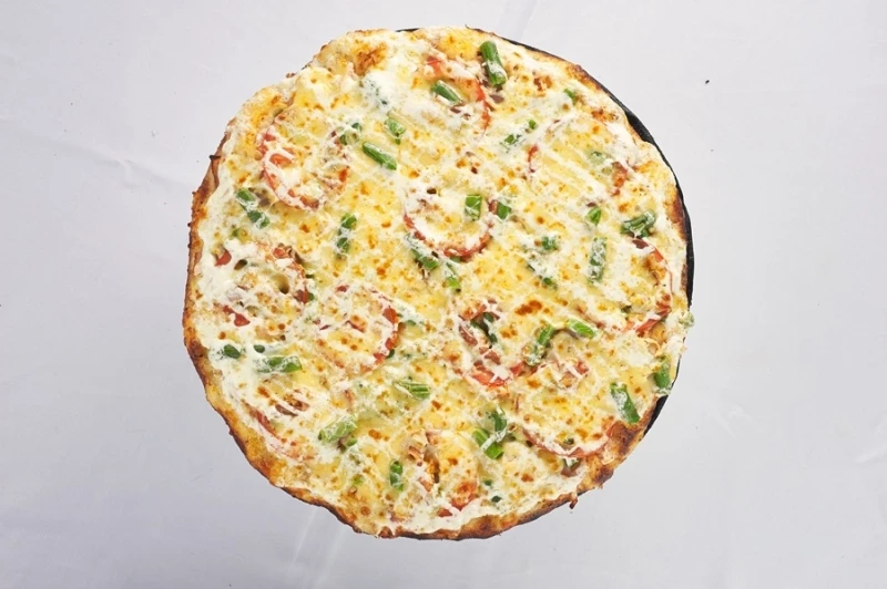 В состав пиццы входит курочка копченая, болгарский перец, зеленый горошек, консервированная кукуруза, красный перец, чеснок, сыр, майонез